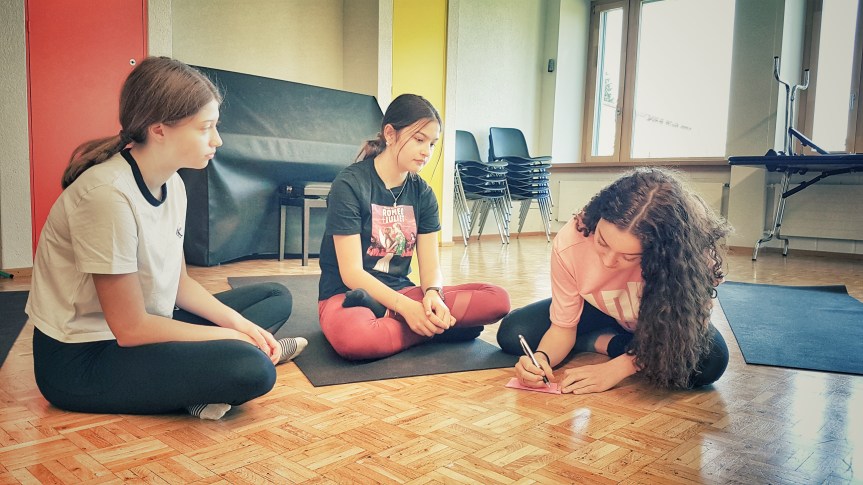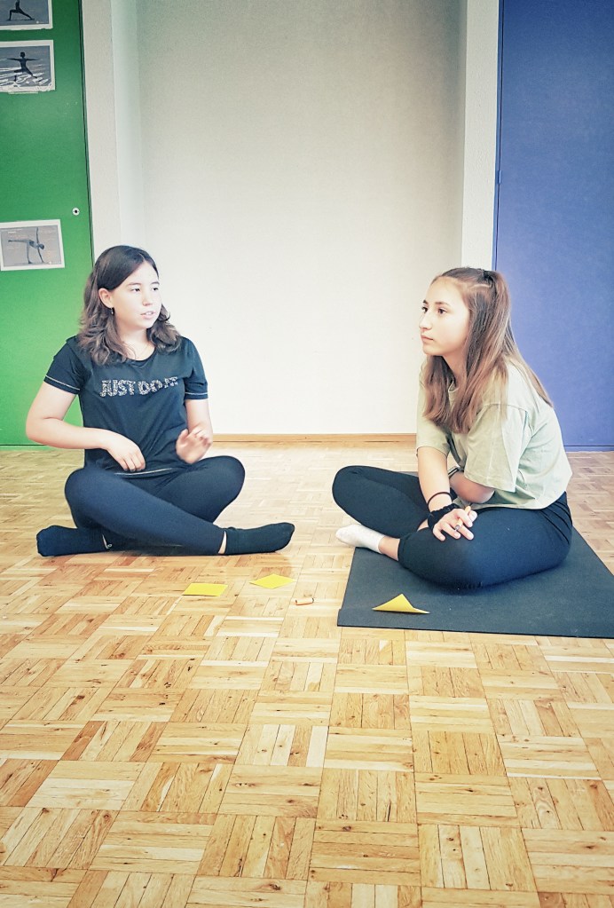 Als nächste Aufgabe bitte ich die Mädchen auf einem weiteren Zettel drei Dinge zu notieren, die sie an sich selbst besonders mögen, worauf sie stolz sind. Davon muss je ein Punkt ein äusseres Merkmal und ein charakterbezogenes Merkmal sein. Und obwohl das so liebenswürdige, tolle junge Frauen sind, tun sie sich sichtlich schwer mit dieser Aufgabe! Das zu sehen macht mich traurig. Ich ermuntere sie weiterhin dazu, bis alle drei Dinge aufgeschrieben haben. Diese kleben sie direkt vor ihre Matte auf den Boden.