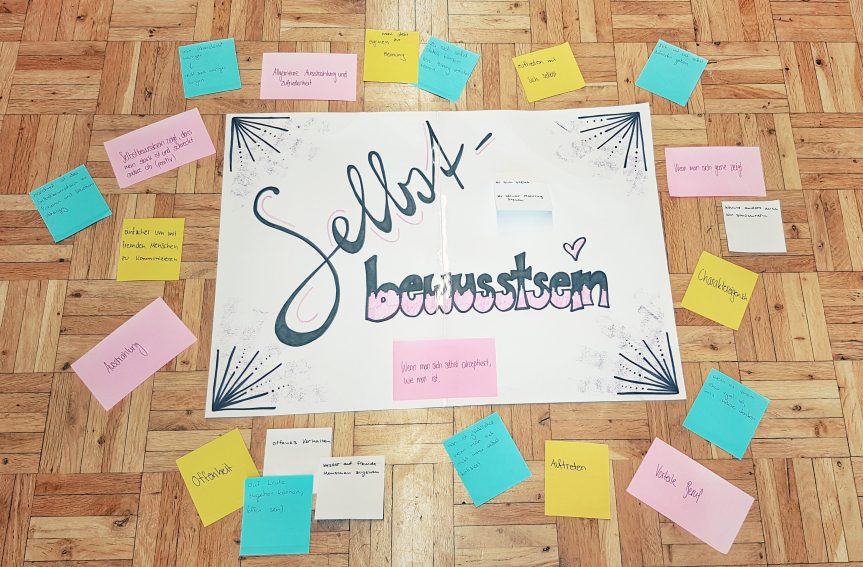 Um ein Gespür dafür zu bekommen, in welchen Bereichen die Mädchen unsicher sind, bitte ich sie nur einen Bereich aufzuschreiben, in dem sie gerne selbstbewusster wären. Ich lese diese persönlichen Notizen der Jugendlichen nicht, sondern frage nur nach, wie viele der Mädchen ein äusseres Merkmal aufgeschrieben haben – und das waren alle.