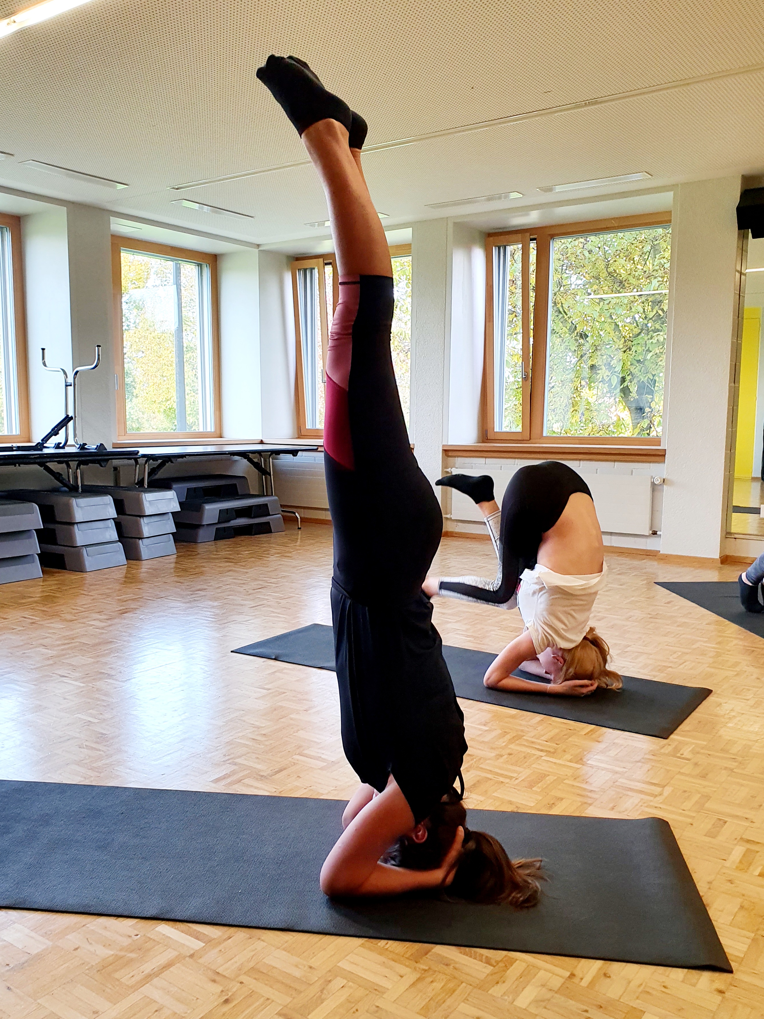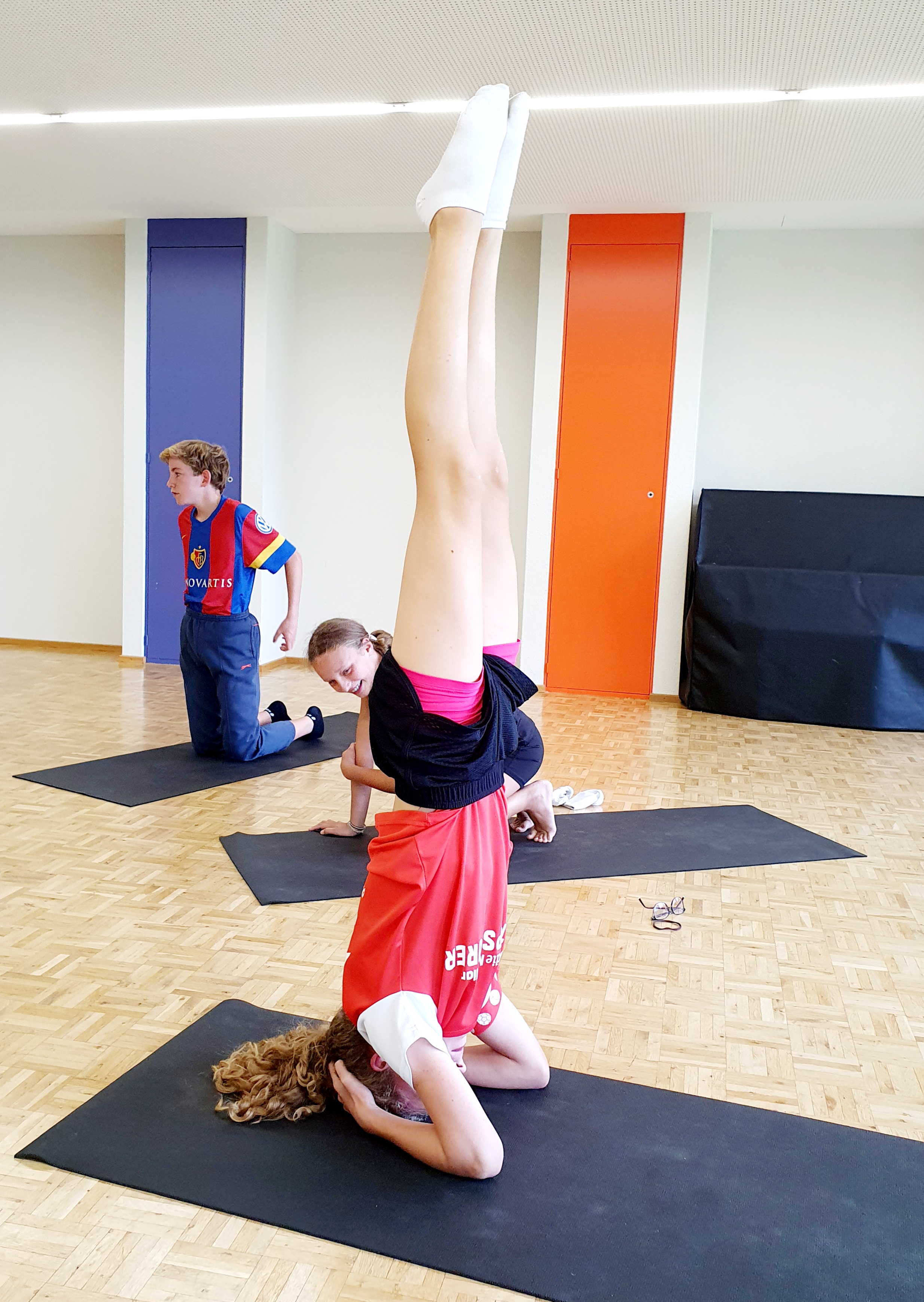Dann machen die Schüler/innen mit Anleitung ihre ersten Erfahrungen mit dem Unterarm-Kopfstand.
